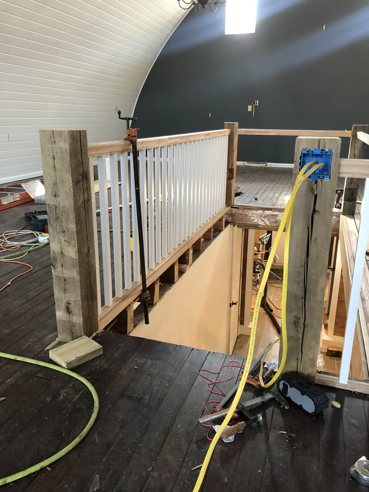 Previous to us owning it, the Barn had been used as a church, but the person we bought it from had converted it from the church to a home. The basics were there but we did have to do some construction to bring it up to code. The staircase at the center was too wide and wasn’t anchored properly. Our contractor flipped its direction, which allowed the base to be facing the front entry. Salvaged barn wood from a farm in Plainfield, Illinois was brought in from Reclaimed Wood Chicago to make the stair treads and newel posts. They’re pretty amazing- you can see the hatch marks from when they were hand hewn with an ax.